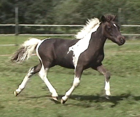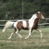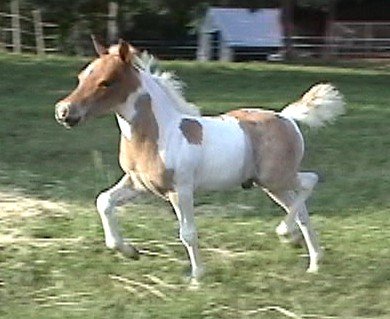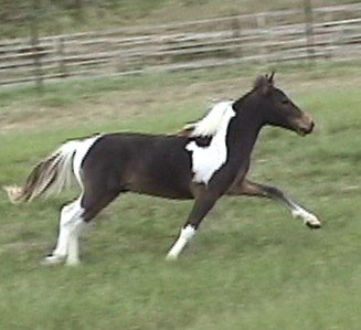 No doubt about it, he is homozygous for the pinto trait; both sire and dam are homozygous for pinto. This is a very flashy colt with super length of neck, smooth body and nice fluid action. (Foaled: 4-6-04) SOLD - Switzerland